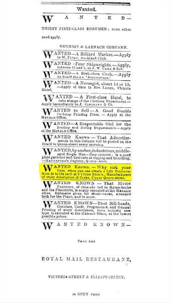 A ‘life preserver’ jacket made from cork was widely advertised in the late 19th century. Their popularity increased as ships began to be made from heavy iron rather than wood because wood could provide a life raft of sorts for shipwrecked sailors whereas iron sunk. However, there were no requirements to provide or wear them, leaving responsibility for their use to the individual. An advertisement in the New Zealand Herald (19 November 1878, asks ‘Why risk your lives when you can obtain a Life Preserver?’.