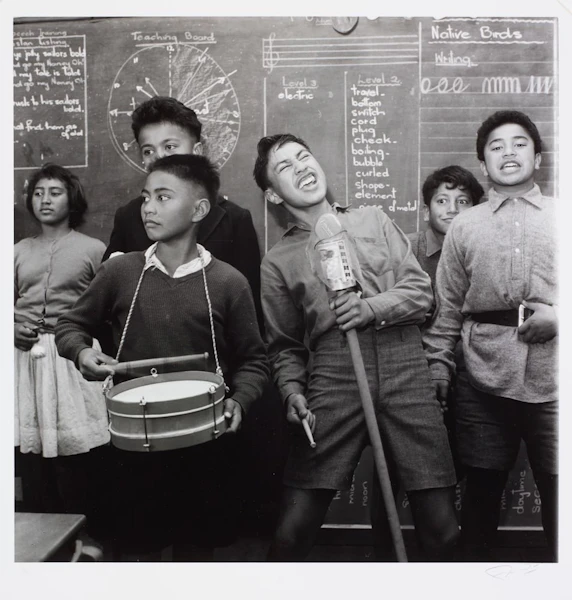 The details are also interesting in this photograph of children at Whatatutu Primary School in 1963. An Edmonds baking powder tin turned into a microphone, chalk writing on the classroom blackboard, Westra’s signature on the bottom right corner of the print. It is the scene that is captivating though; the range of expressions including cool detachment, and, especially, the singer, who is immersed in the moment.
