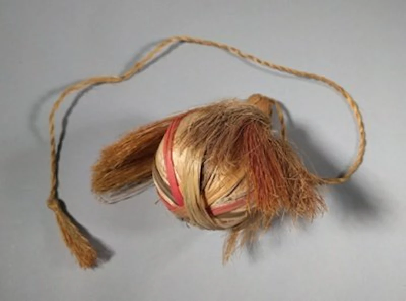 The dried raupō leaves are fashioned around an inner material, often the dried soft brown seed heads, and the decorative application of those leaves featuring dyed or undyed material begins to take on the form of a poi. The circular section with the raupō materials is then bound closed with plaited muka taking on the form of a handle or grip completing the kinetic percussion instrument.