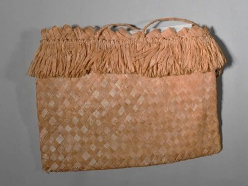 This kete houhere has a main body woven in a takitahi style - the ‘one up, one down’ technique. There is a delicate fringe-like finish around the top and it has two handles of the same fibre. It is un-dyed.
